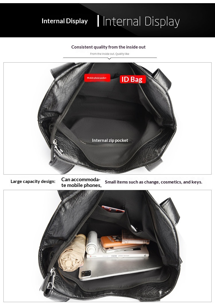 Internal bag structure: zippered hidden pocket, phone pocket