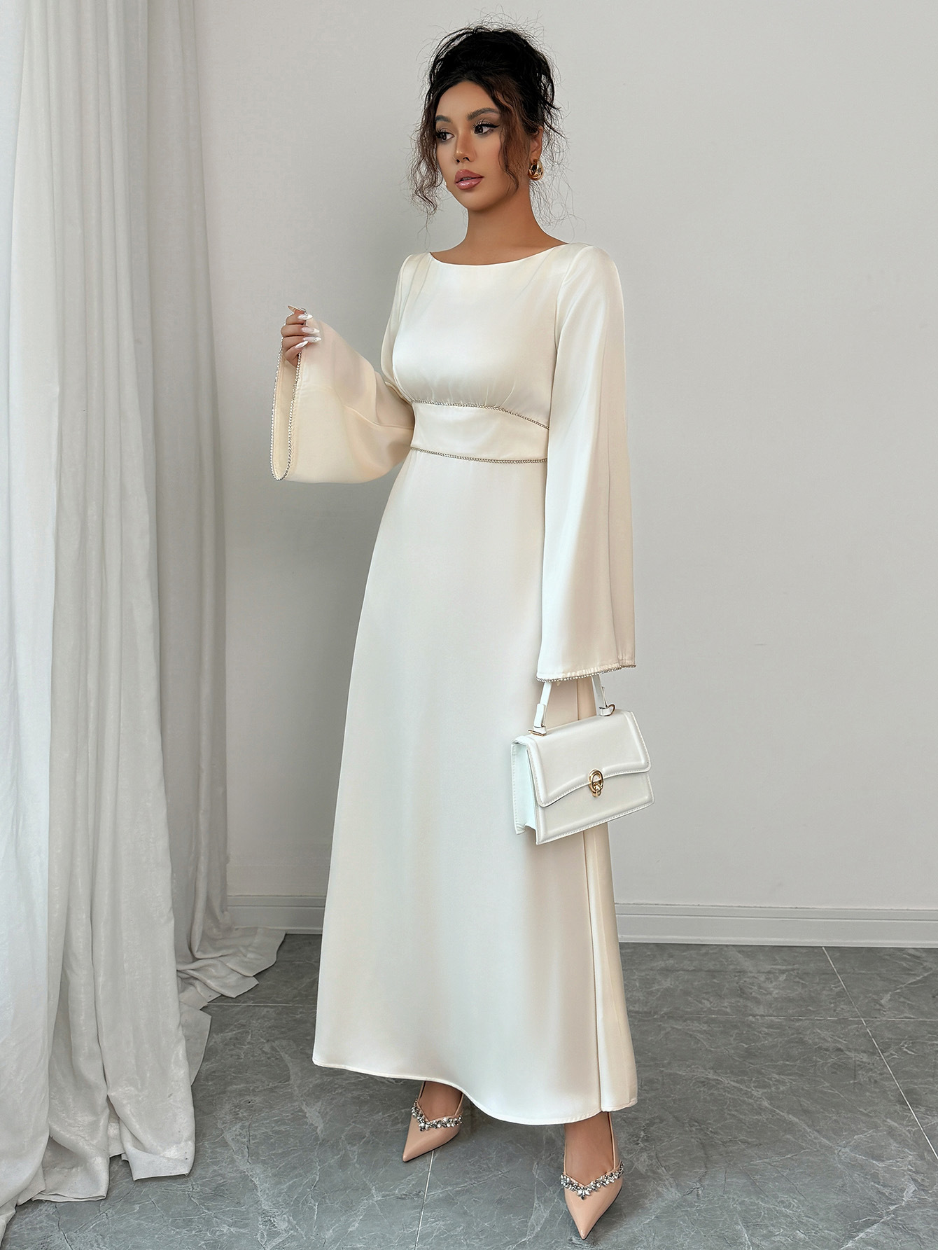 Elegant Graceful Style Waist Solid Color Long Sleeve Dress