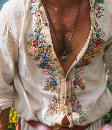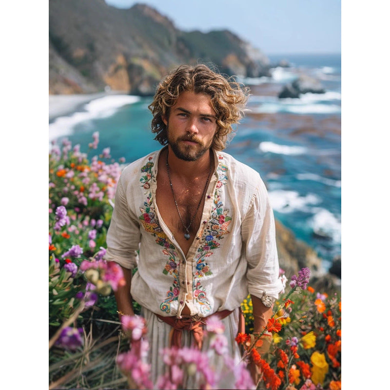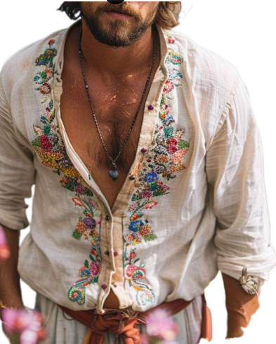 Retro Men's Casual Tops Open Collar Embroidered Shirt