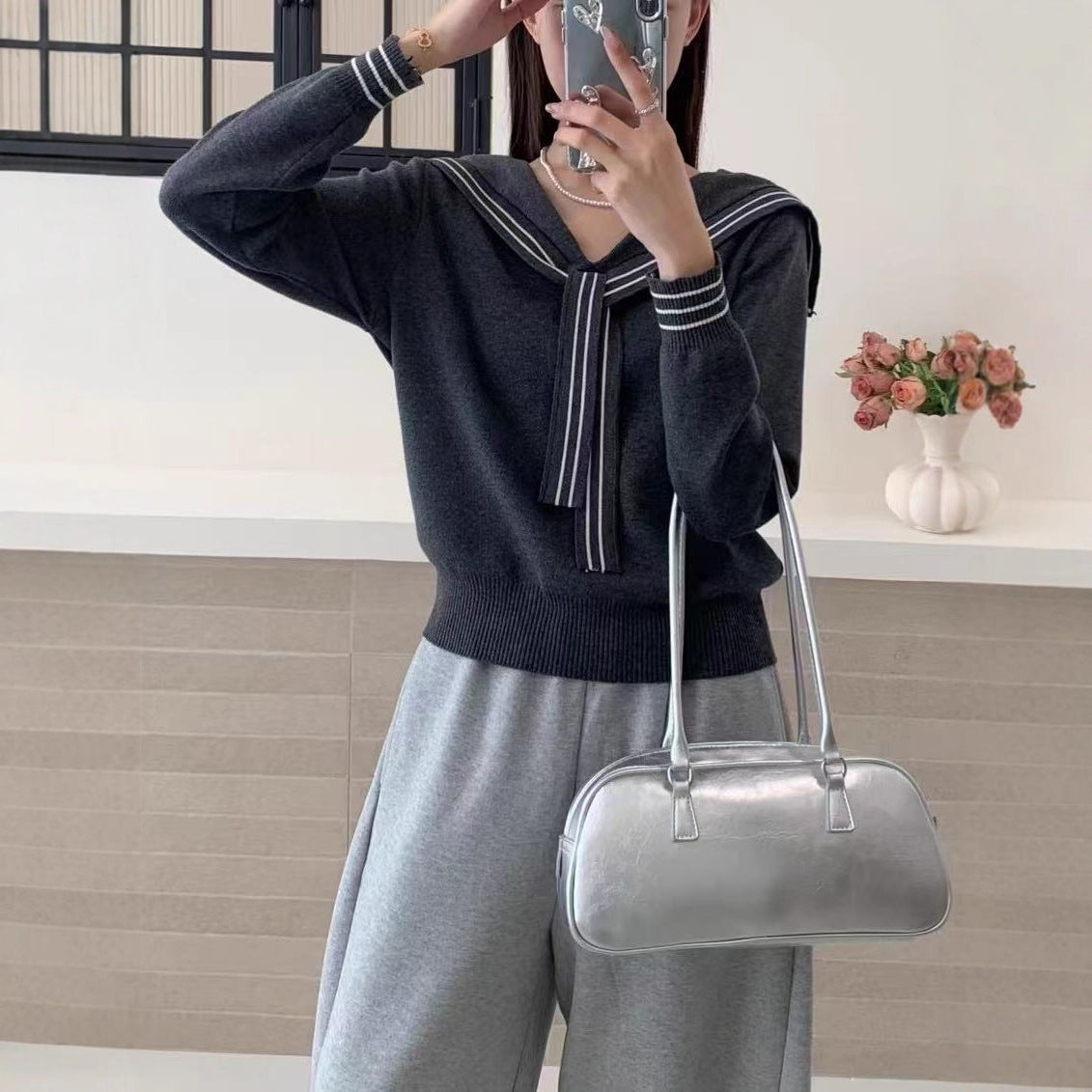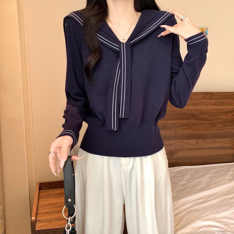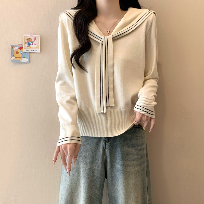 Sailor Collar Lace-up Striped Knitted Coat Women's Sweater